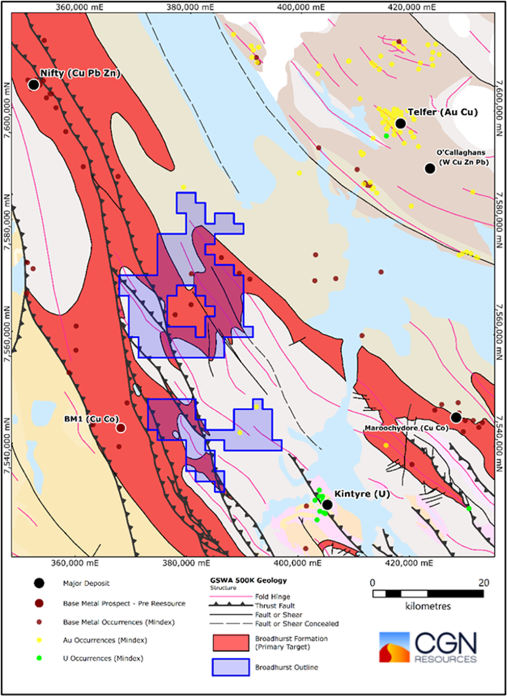 The Broadhurst Project is a highly prospective copper exploration project currently under application in the world-class Paterson Province, a globally significant metallogenic province that hosts tier-one copper-gold deposits. Broadhurst sits along major structural corridors and favourable Proterozoic host rocks analogous to the world-class Nifty Copper Mine, providing a compelling geological model for high-grade copper mineralisation.